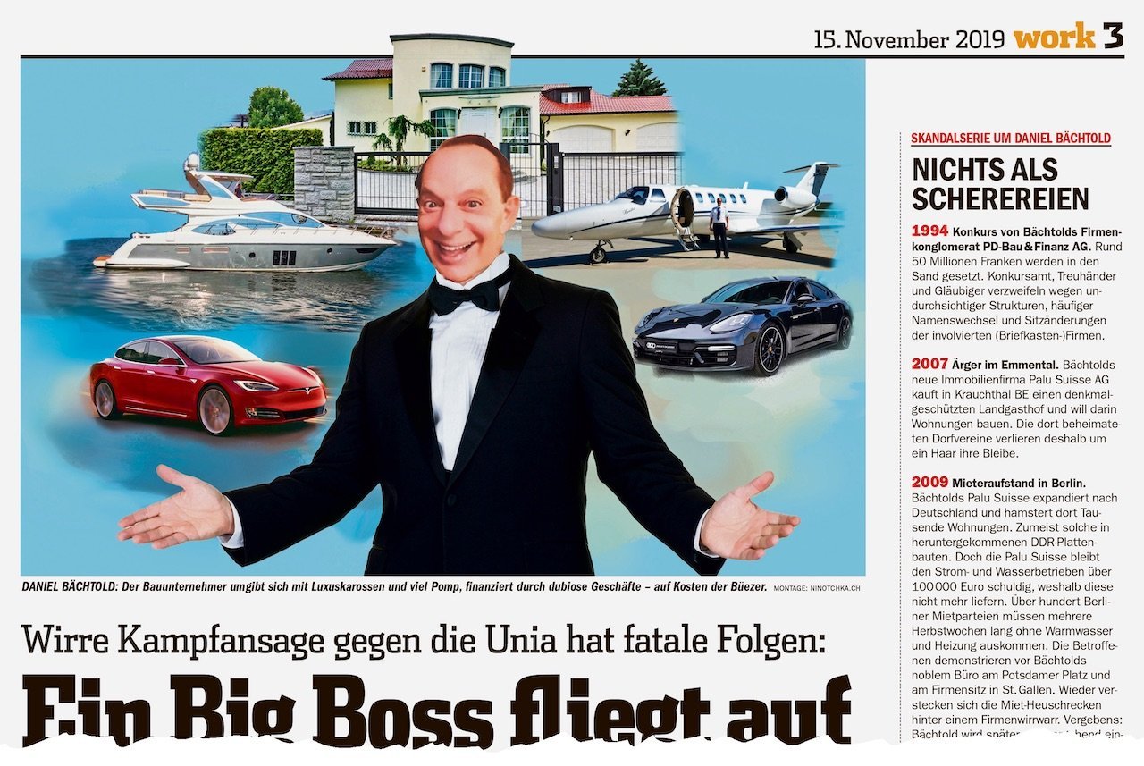 Er wusste sich hinter einem obskuren Geflecht aus zahllosen Briefkasten- und Baufirmen zu verstecken. Bis zum Herbst 2019, als ihm die Unia auf die Schliche kam. Denn die von Bächtold kontrollierte SRI Baumanagement AG hatte rund 30 Baubüezer und Büroangestellte geschasst und sie um ihre verdienten Löhne gebracht. work machte diesen und weitere haarsträubende Fälle publik (siehe rebrand.ly/entlarvt). Zeitgleich wartete auch das «St. Galler Tagblatt» mit brisanten Recherchen auf. Doch auf das Licht der Öffentlichkeit reagierte Bächtold höchst allergisch.