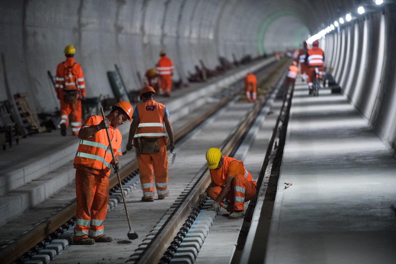 LANGES WARTEN AUF GERECHTIGKEIT: Baubüezer verlegen Schienen im Ceneri-Basistunnel. (Foto: Keystone)