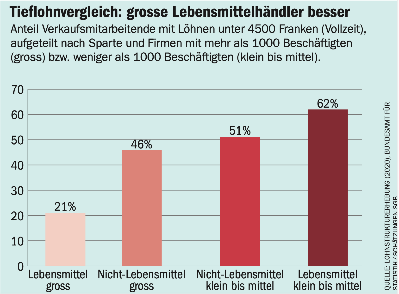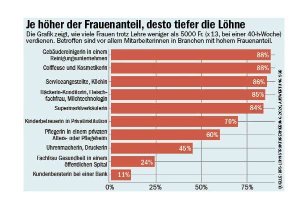 Der Anteil der Tieflöhne hat sich seit der letzten Untersuchung im Jahr 2020 nicht verändert und liegt weiterhin bei 10,5 Prozent. Rund ein Drittel der Berufstätigen mit einem Tieflohn haben eine abgeschlossene Berufslehre. Vier von zehn Frauen verdienen weniger als 5000 Franken im Monat. «Aus Gewerkschaftssicht ist ein Monatslohn von 5000 Franken mit Lehre das Minimum», schreibt der SGB. Besonders tiefe Löhne werden in der Gastronomie, in der Hotellerie und im Detailhandel bezahlt.