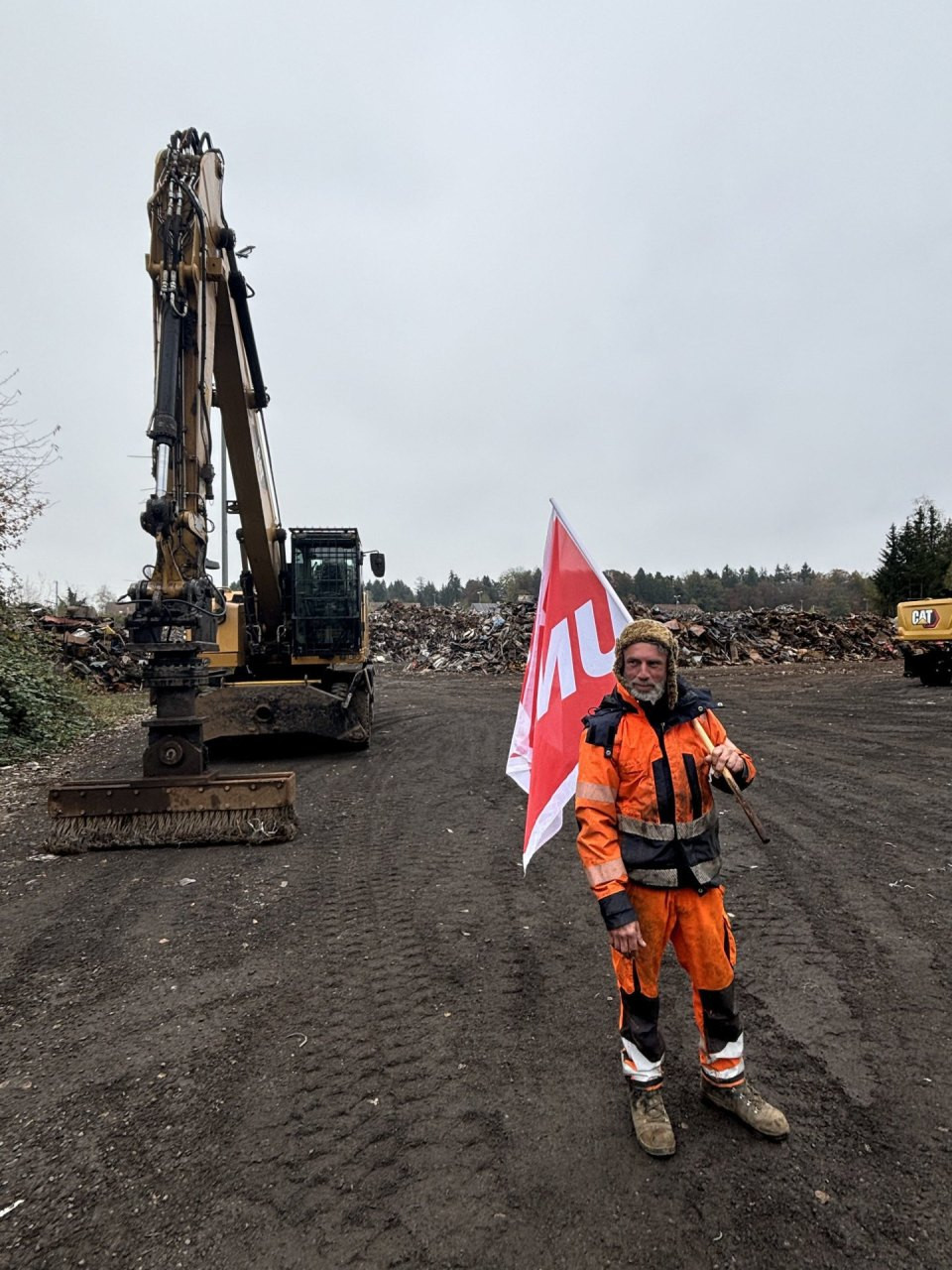 Heute wird ein Grossteil des Schweizer Stahlschrotts per Bahn nach Gerlafingen transportiert. Auf dem Schrottplatz neben dem Stahlwerk sitzt Femi Rudai (42) in seinem Bagger und sortiert den Schrott, der gerade angeliefert wurde. Er und seine fünf Teamkollegen machen hier die Rohstoffe für das Recycling im Stahlwerk bereit. Während seiner Mittagspause sagt er zu work: «Die Geschichte ist bedrückend, ich halbe schlaflose Nächte. Es ist himmeltraurig was hier abgeht!» Im Moment sehe es überhaupt nicht gut aus, aber aufgeben sei für ihn, der seit 12 Jahren im Betrieb arbeitet, keine Option. Von der Demo auf dem Bundesplatz im Oktober hat er auch eine Unia Fahne mitgenommen, die nun über dem Schrottplatz weht. Am 9. November (siehe Box unten) werde er mit seinen Kollegen erneut für den Erhalt des Stahlwerkes demonstrieren. Auch Grolimund und Pfander werden an der Grossdemo in Gerlafingen teilnehmen.