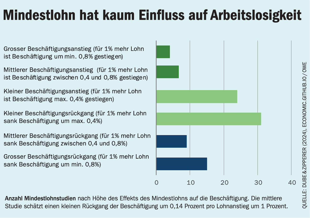 Für den Mindestlohn in Genf konnten gleich zwei Studien im Auftrag des Kantons keinen wesentlichen Einfluss auf die Arbeitslosigkeit nachweisen. Selbst bei jungen Beschäftigten ohne Lehre finden sich keine besorgniserregenden ­Auswirkungen. Auch der Tessiner ­Mindestlohn kann nicht mit höherer Arbeitslosigkeit in Verbindung gebracht werden. Er erhöhte aber die tiefsten Löhne merklich, wie eine neue Untersuchung der Universität der italienischen Schweiz zeigt. Ein plausibler Erklärungsansatz:
