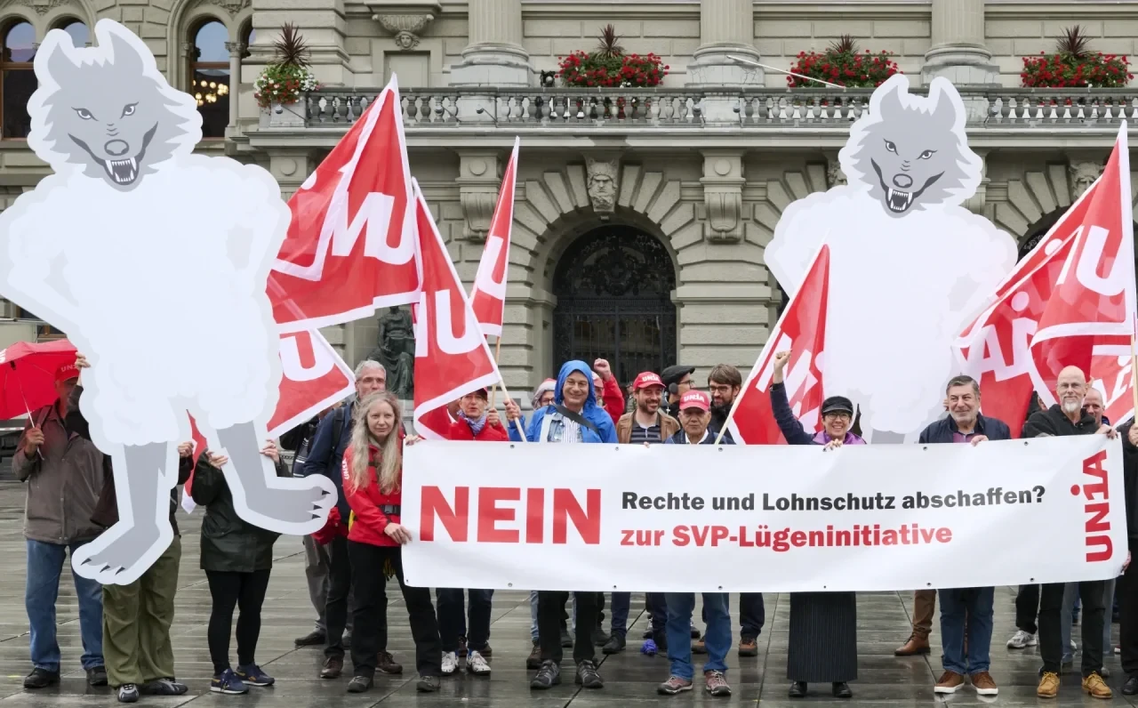 Dagegen leisten die Gewerkschaften mit aller Kraft Widerstand. Die Unia hat vor dem Bundeshaus auf die schädlichen Folgen der Initiative aufmerksam gemacht. An der Aktion erklärte Unia-Präsidentin Vania Alleva: