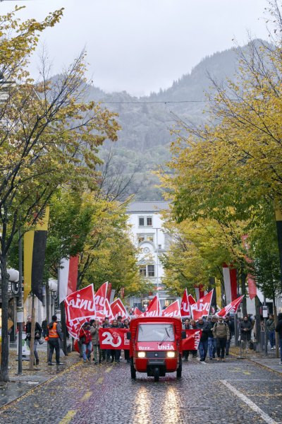 Das Ende des ersten Kongresstages wird zu einem von vielen Höhenpunkten: Die 400 Delegierten marschieren bei Wind und Wetter durch die Innenstadt von Brig. Ein Ereignis, welches die Stadt wohl nicht alle Tage sieht. Die Reiseberaterinnen stehen verwundert ans Fenster. Der Coiffeur nebenan muss sein Werkzeug kurz zur Seite legen und sich auf den Spaziergang der Gewerkschaft, statt auf die Frisur seines Kunden zu konzentrieren. Und Büezer in Arbeitskleidung ziehen den Nachhauseweg in die Länge, um dem Treiben im Städtchen zuzuschauen.