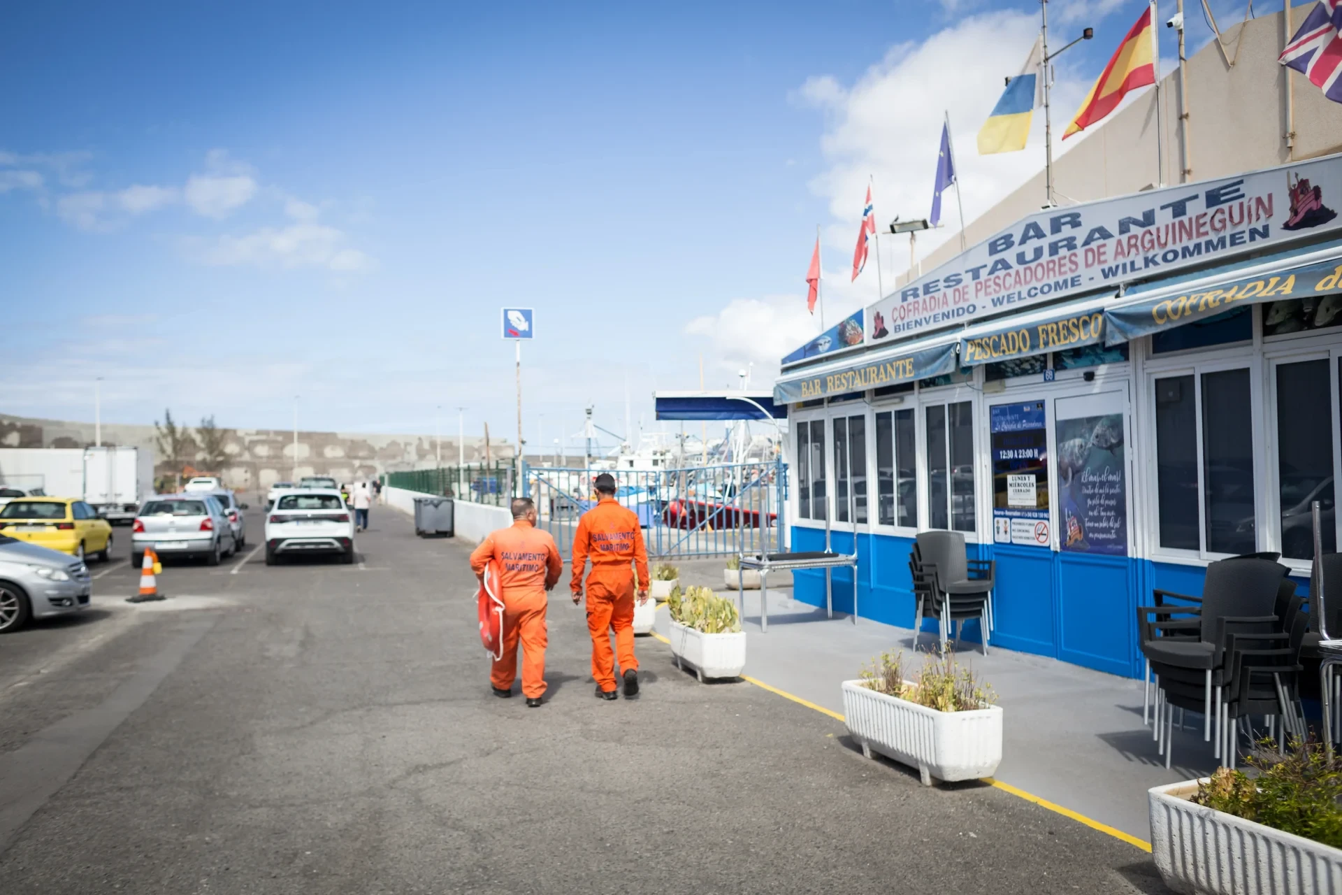 Zwischen den Haufen von Hummerfallen am Hafen übertönt einer Schweissmaschine die Stimmen vom proppenvollen Touristenmarkt. Direkt nebenan warten die Seeleute des Salvamento Maritimo auf einen möglichen Alarm – und bereiten Hunderte Schwimmwesten vor. Einer von ihnen gibt sich als Gewerkschafter zu erkennen, als Mitglied der anarchosyndikalistischen CGT. Er sagt: