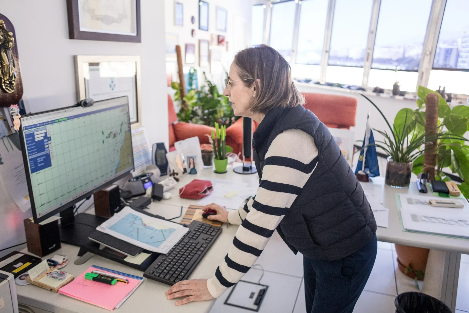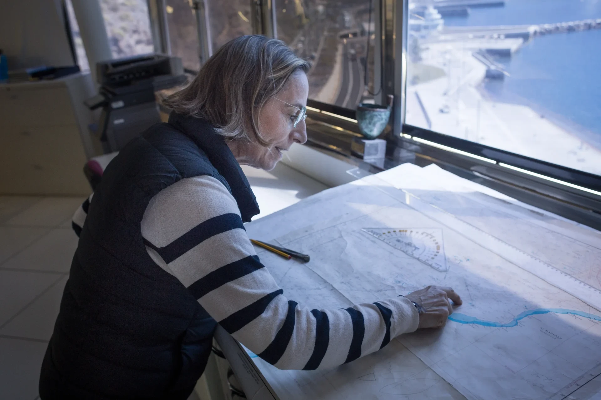 Vom obersten Stock des Turms der Capitanía Marítima, der Seefahrtsbehörde, kann man den gesamten Hafen von Santa Cruz de Tenerife überblicken. Wie auf der Brücke eines Schiffes entrollt Dolores Septién Terreros die Seekarte auf ihrem Tisch. Sie leitet das örtliche Maritime Rettungszentrum.